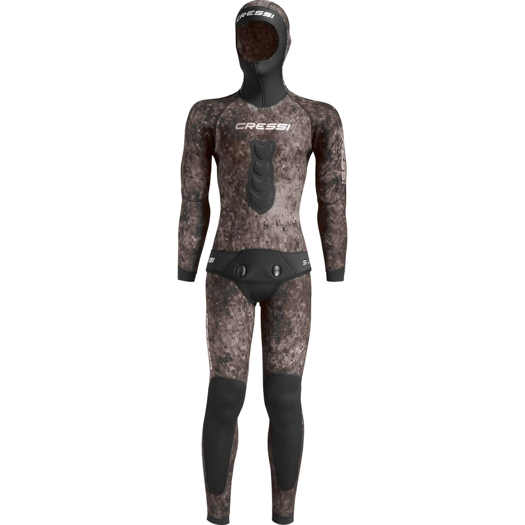 Wetsuit created with the exclusive new cressi camouflage dark digital specter pat, computer designed to make it more difficult for prey to create solid images, thereby confusing the wearer with the background. Preformed anatomical cut. Jacket with padded reinforcement in the chest, smoothskin watertight seals on the hood, wrists, and waist, and reinforced powertex lining at the elbows and waist. High-waisted trousers with watertight smoothskin seals at the ankles and waist, and powertex reinforcements on the knees. Camouflage color: dark-specter